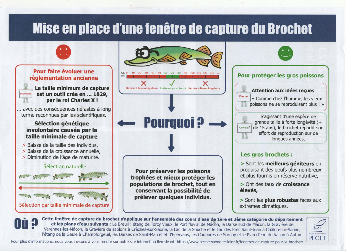 A partir de cette date, sur l'ensemble des canaux et cours d'eau de 1ère et 2nde catégorie du département de Saône et Loire, tous les brochets de longueur inférieure à 60 cm et supérieure à 80 cm devront obligatoirement être remis à l'eau.