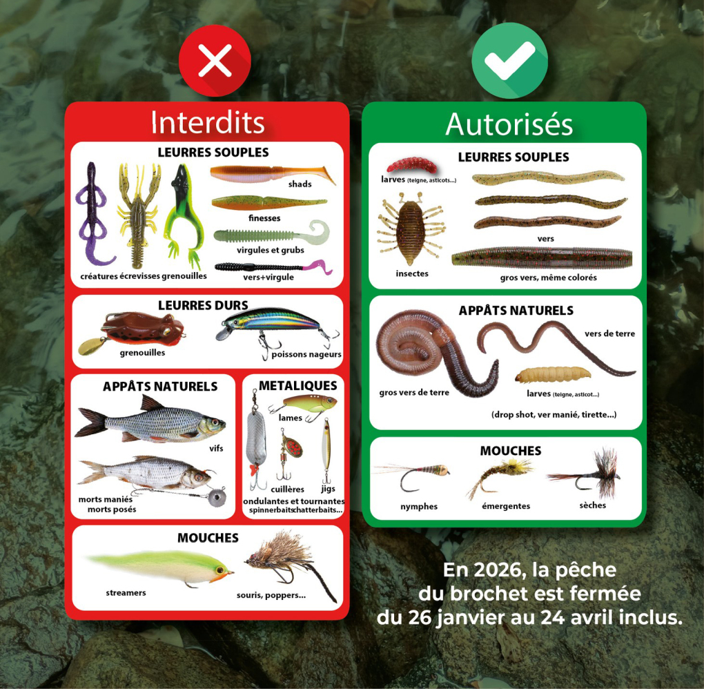 Pendant la période d'interdiction spécificique de la pêche du brochet, la pêche au vif, au poisson mort ou artificiel et aux leurres susceptibles de capturer ce poisson de manière non accidentel est intredite dans les eaux classées en 2ème catégorie.